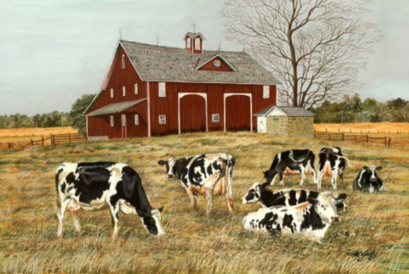 Red Barn and Grazing Cows 11x17 - egg tempera $1000.